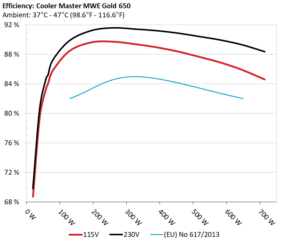 The PSU`s efficiency under high ambient temperatures with 115V and 230V input. For this graph the results of the 10-110% load regulation table are used.