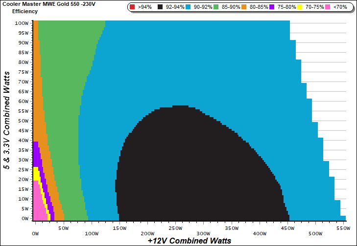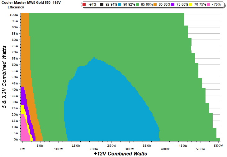 This graph depicts the PSU`s efficiency throughout its entire operational range. For the generation of the efficiency and noise graphs we set our loaders to auto mode through our custom-made software before trying thousands of possible load combinations.