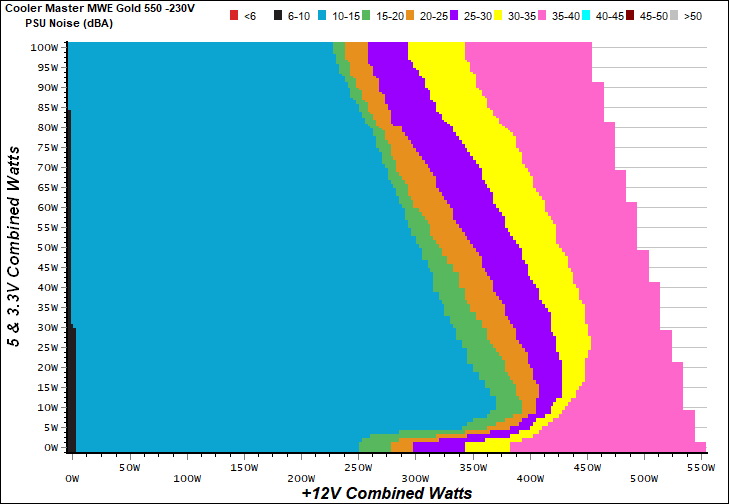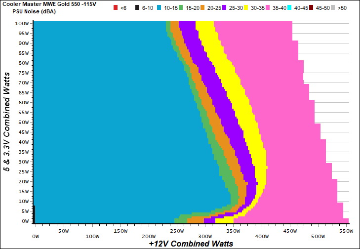 The PSU`s noise in its entire operational range and under 30-32 °C ambient is depicted in this graph. The X axis represents the load on the +12V rail(s) while the Y axis is the load on the minor rails.