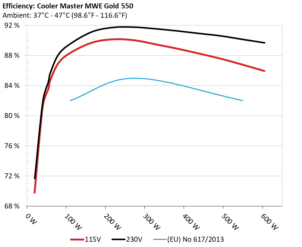 The PSU`s efficiency under high ambient temperatures with 115V and 230V input. For this graph the results of the 10-110% load regulation table are used.