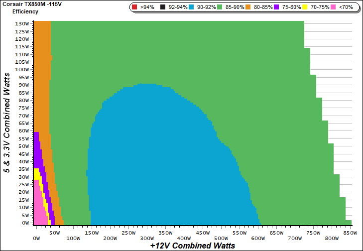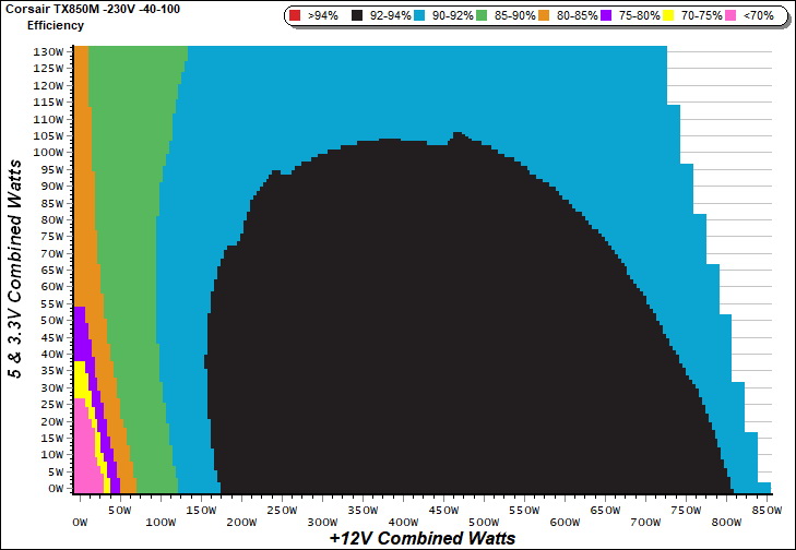 This graph depicts the PSU`s efficiency throughout its entire operational range. For the generation of the efficiency and noise graphs we set our loaders to auto mode through our custom-made software before trying thousands of possible load combinations.