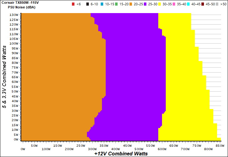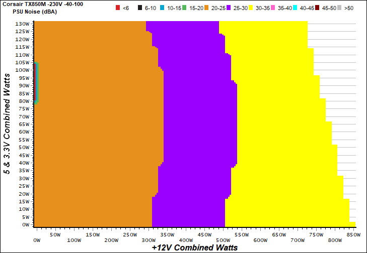 The PSU`s noise in its entire operational range and under 30-32 °C ambient is depicted in this graph. The X axis represents the load on the +12V rail(s) while the Y axis is the load on the minor rails.