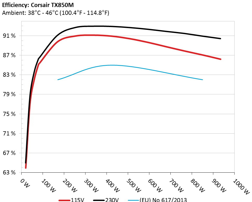 The PSU`s efficiency under high ambient temperatures with 115V and 230V input. For this graph the results of the 10-110% load regulation table are used.