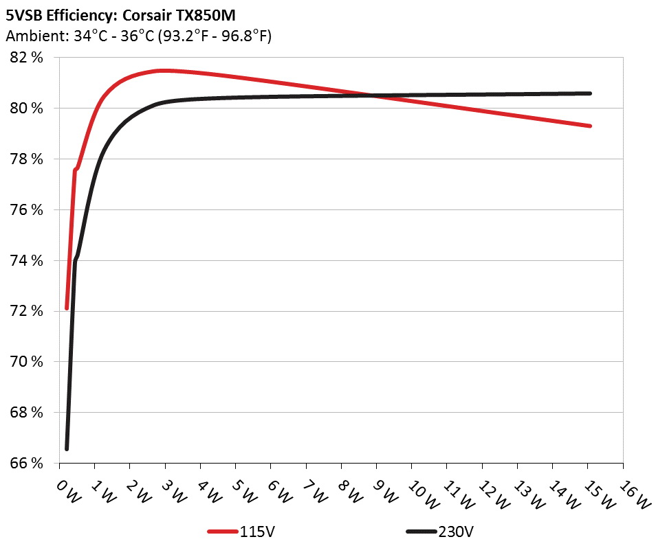 This graph depicts the efficiency levels of the 5VSB rail with 115V and 230V input.