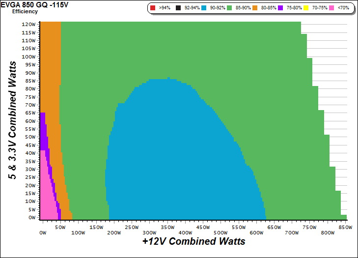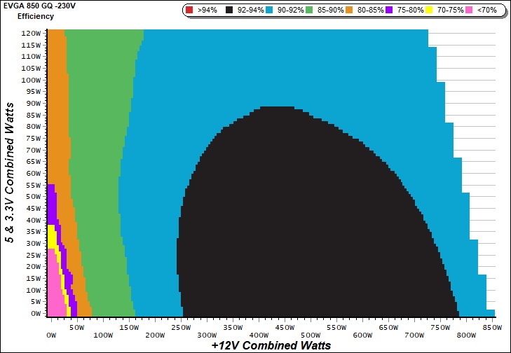 This graph depicts the PSU`s efficiency throughout its entire operational range. For the generation of the efficiency and noise graphs we set our loaders to auto mode through our custom-made software before trying thousands of possible load combinations.