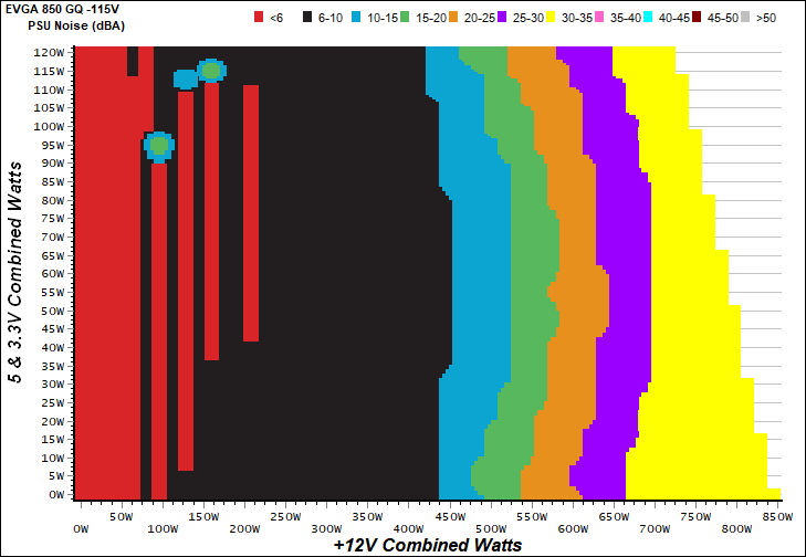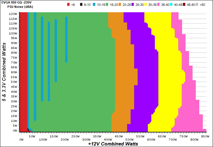 The PSU`s noise in its entire operational range and under 30-32 °C ambient is depicted in this graph. The X axis represents the load on the +12V rail(s) while the Y axis is the load on the minor rails.