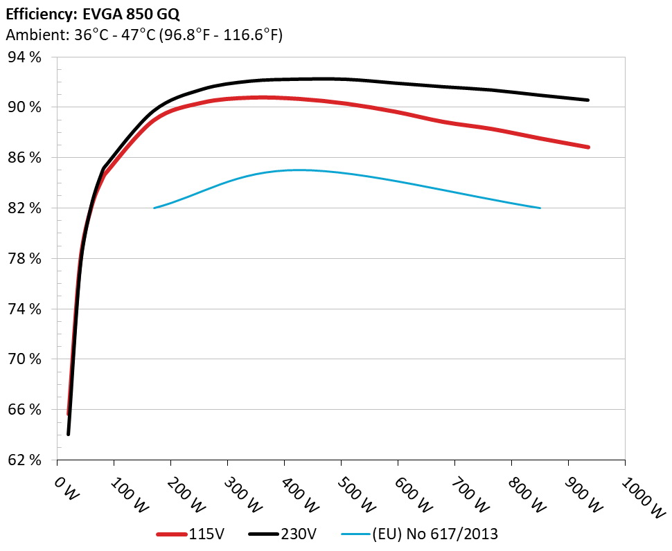 The PSU`s efficiency under high ambient temperatures with 115V and 230V input. For this graph the results of the 10-110% load regulation table are used.