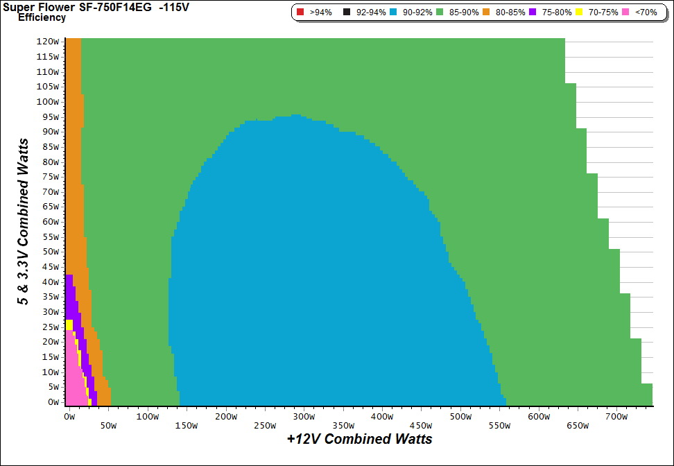 This graph depicts the PSU`s efficiency throughout its entire operational range. For the generation of the efficiency and noise graphs we set our loaders to auto mode through our custom-made software before trying thousands of possible load combinations.