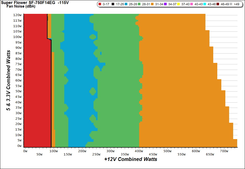 The PSU`s noise in its entire operational range and under 30-32 °C ambient is depicted in this graph. The X axis represents the load on the +12V rail(s) while the Y axis is the load on the minor rails.