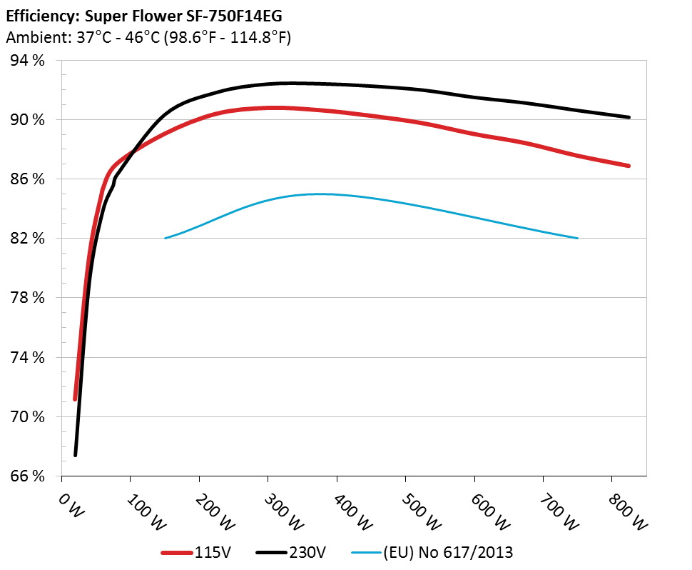 The PSU`s efficiency under high ambient temperatures with 115V and 230V input. For this graph the results of the 10-110% load regulation table are used.
