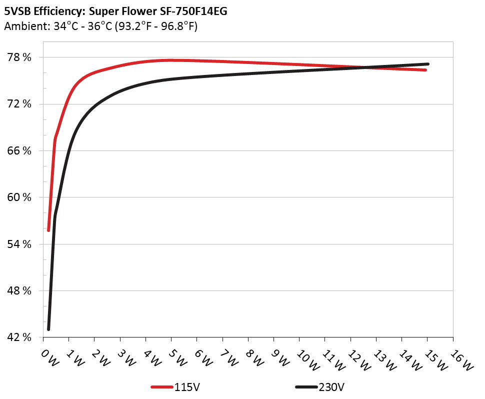 This graph depicts the efficiency levels of the 5VSB rail with 115V and 230V input.